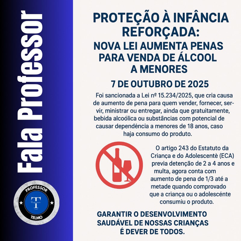 O dia 7 de outubro de 2025 marca mais um avanço na proteção de crianças e adolescentes. Foi sancionada a Lei nº 15.234/2025, que cria causa de aumento de pena para quem vender, fornecer, servir, ministrar ou entregar — ainda que gratuitamente — bebida alcoólica ou substâncias com potencial de causar dependência a menores de 18 anos, caso haja consumo do produto.
