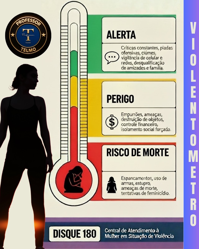 O "violentômetro" é um instrumento pedagógico que ilustra a escalada da violência em fases, começando por comportamentos que muitas vezes são naturalizados (piadas, ciúmes, controle) e chegando a agressões físicas graves e feminicídio.